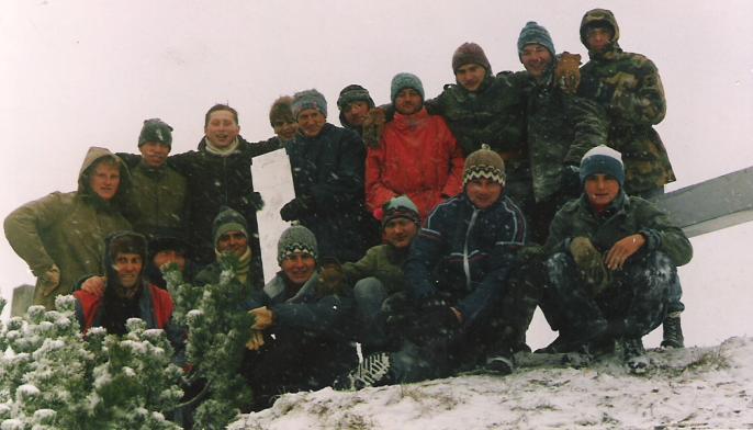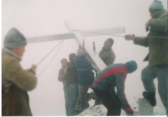 Ale predsa. Po 3 hodinách trápenia sa priblížime k vrcholu, aby sme v ešte náročnejšom vrcholovom úseku dokonali naše dielo. Prichádzajú aj blúdiaci Kubalovci – blúdili až na náprotivnej strane – v masíve Choča. Ujo nám prepiluje konáre stojace nám v ceste. Kúsok po kúsku a v malú chvíľu stojíme šťastní na vrcholku. Svieti slnko a my ešte nevnímajúc krásne pohľady, snažíme sa roztrasenými rukami niečo zjesť. Prichádzajú ostatní a stojíme tu šťastní, že sme to dokázali. Milan polial pálené – už je lepšie. Polial ešte raz,… – už je dobre. Poniektorí sa pomaly rozchádzajú, ostatní ostávajú až do 17.00 hod. večernej. Majster Miloš – teraz aj náš tesár – vsadí rameno a natiahneme v dolnej časti plech proti vandalom. Peťo navŕta diery, natrieme kríž farbou a je čas ísť domov. Nikto nechcel pri zostupe veriť, že tadiaľto sme sa borili s naším bremenom. No zrytý sneh pod našimi nohami je toho dôkazom.