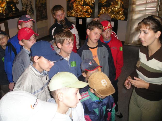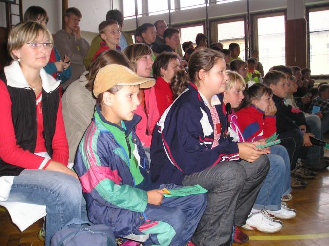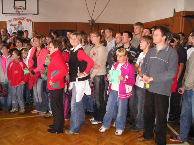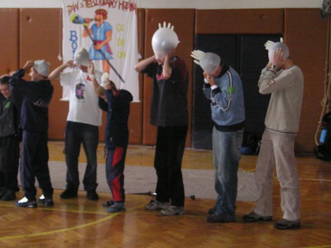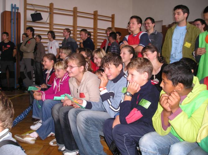 Doviezli sme sa na parkovisko vedľa futbalového štadiónu. Odtiaľ sme pokračovali do školy pre slepých. Hneď pri vchode sa zapisovalo. Všetko šlo ako po masle, až kým sme my dievčatá nezistili, že sme tam jediné dievčatá. Vtedy nám zaplo, prečo sa všetci po nás pozerajú. Presunuli sme sa do telocvične, kde pokračoval program. Starší animátori odohrali scénku o Gedeonovi a predstavili nám tému Bodky: „Pán s tebou, udatný hrdina.“ Program pokračoval do dvanástej. My dievčatá sme odišli do autobusu. Chlapci mali ešte spytovanie svedomia v skupinách. O pol hodinu prišli, najedli sme sa a išli do centra.