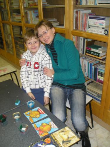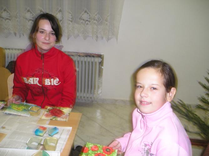 Počas tohto zimného prázdninového popoludnia našu pozornosť upútavala servítková technika. Vďaka nej sme si vyrobili zaujímavé obrázky s motívmi podľa vlastného výberu. Ďalší program vyplnila satinovacia technika – vyrábanie svietnikov pomocou špongie a satinovaciej farby.