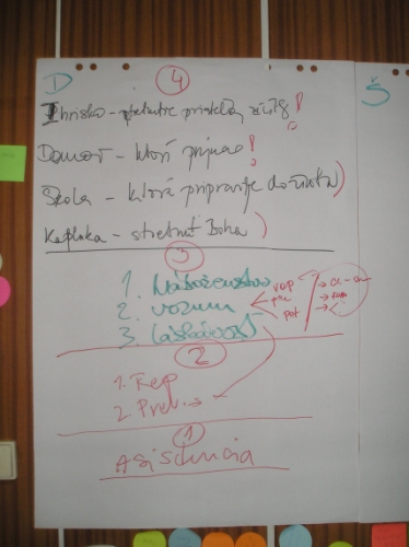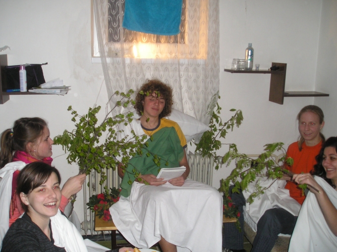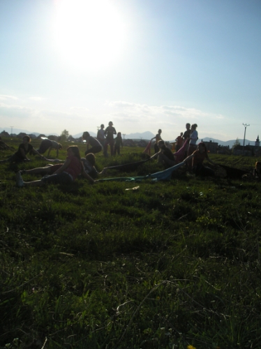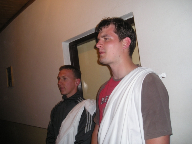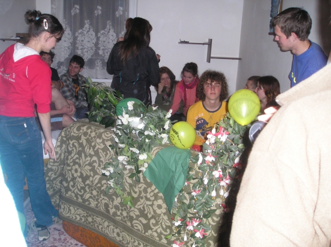 Druhý deň sme sa prebrali na zobudenie našich super školiteľov do indiánskeho tábora :-). Tí nám oznámili že za 5 minút dole bude rozcvička :-). Rozcvička bola krátka, ale keďže bola ešte zima, tak bola patrične svieža. 🙂 Ranná modlitba, raňajky a plno iných aktivít nám spríjemňovalo doobedie a poobede. Hrali sme rôzne hry (chalani futbal, baby sa opaľovali 🙂 a boli sme podelení do skupín, v ktorých sme mali naplánovať tábor podľa vybranej témy. Témy boli veľmi zaujímavé ako napr. Matrix, Gladiátor, Mojžiš, SWAT – jednotka rýchleho nasadenia, Leví kráľ…. Danú tému sme mali nielen naplánovať ale aj prezentovať tak, že sme mali vyzdobiť izbu podľa toho….no to vám bola zábava. 🙂 Pred večerou sme mali ešte krásnu krátku omšu pri blízkom potoku :-).