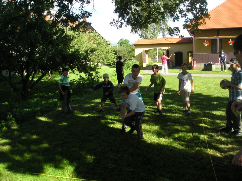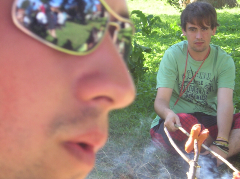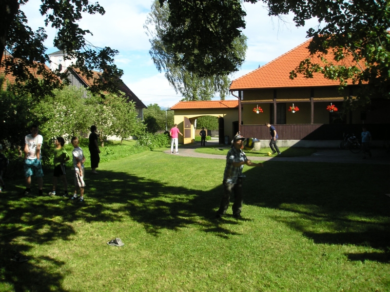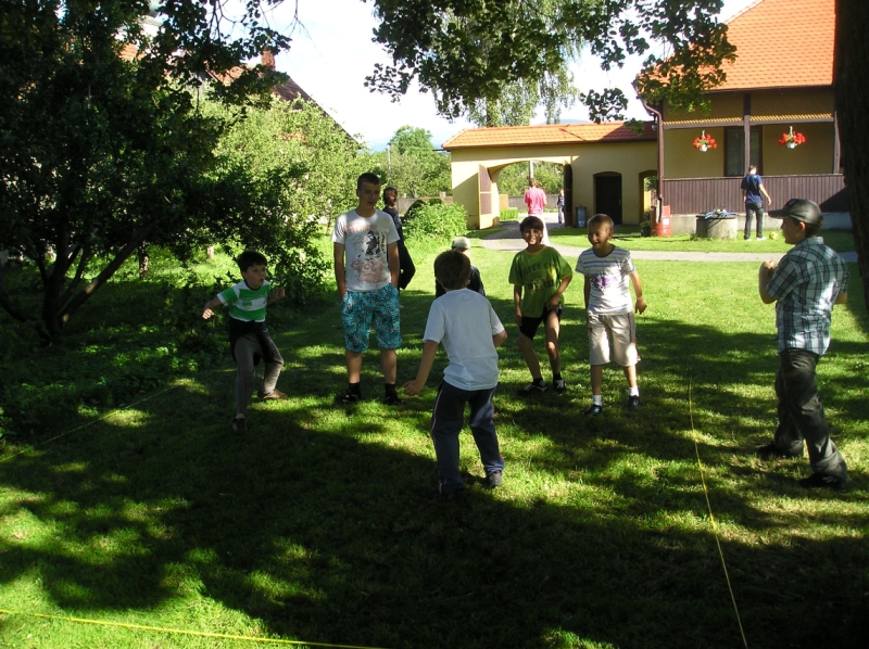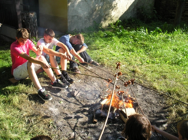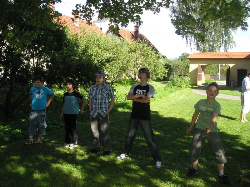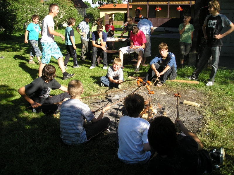 Jedlo, malinovky a ihrisko boli prichystané mohlo sa začať zabávať. Chlapci šantili hrali futbal, lakros, … Neskôr sme pre chlapcov pripravili dve akčné hry, ktoré už mali ohlas na našich táboroch – a to Hu tu tu a Indiánska palička. Chlapci sa rozdelili do 3 tímov menovite Šmolkovia, Cigáni a Hooligans. Súboje boli fakt akčné a napínavé. Po dobojovaní sa chlapci pustili do špekačiek a dobrôt.