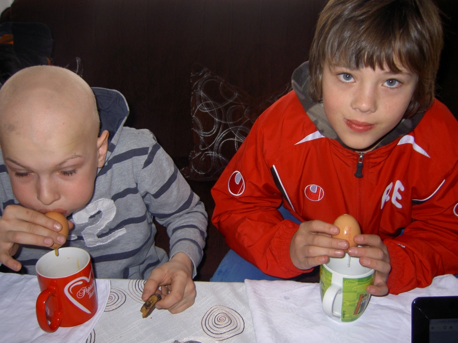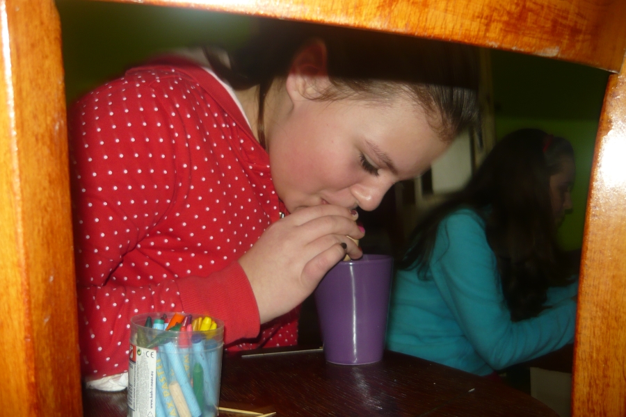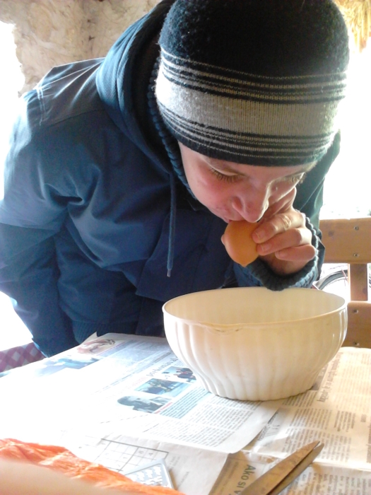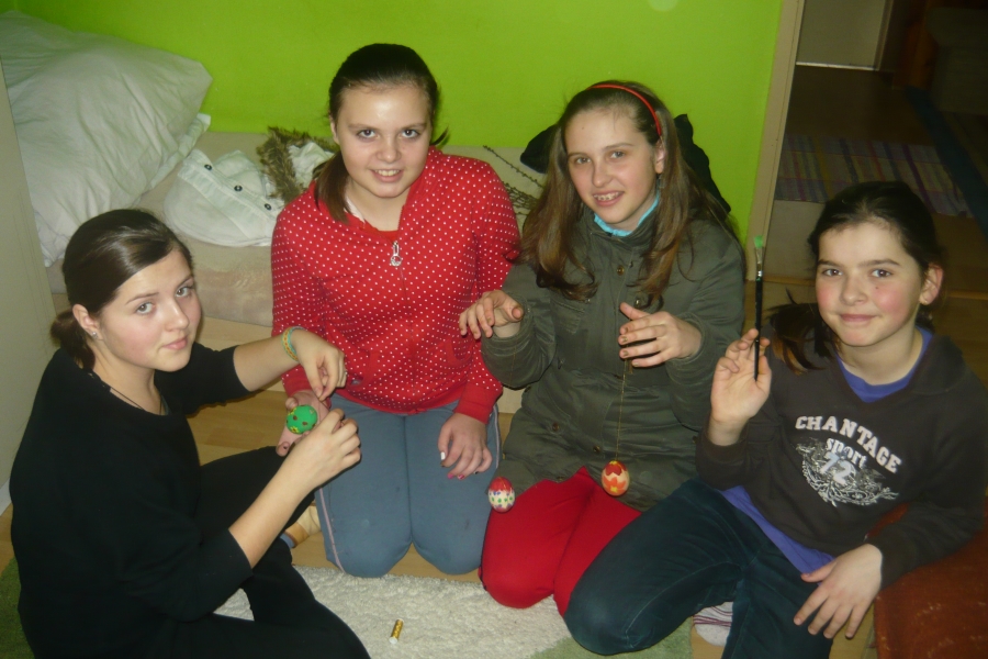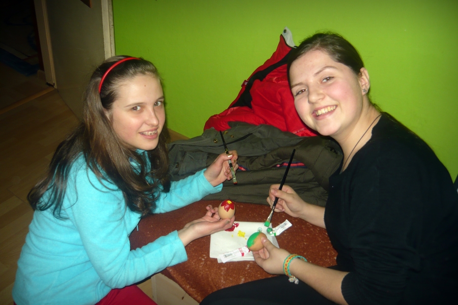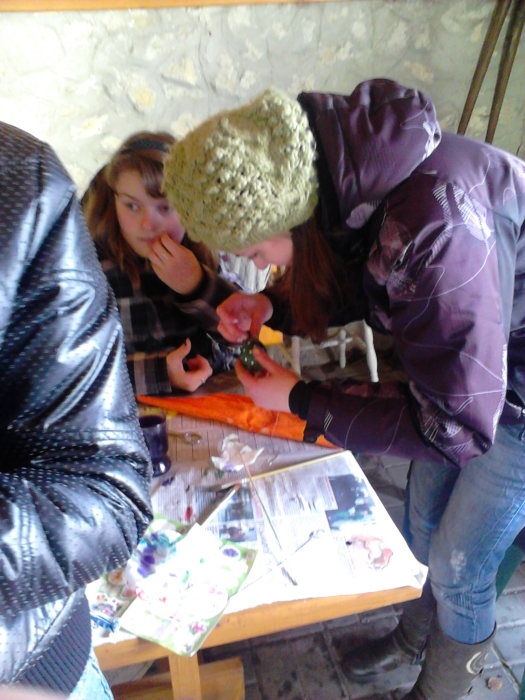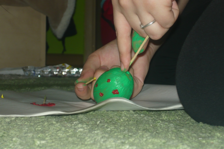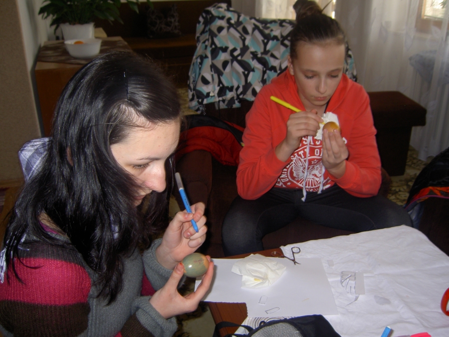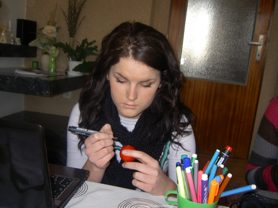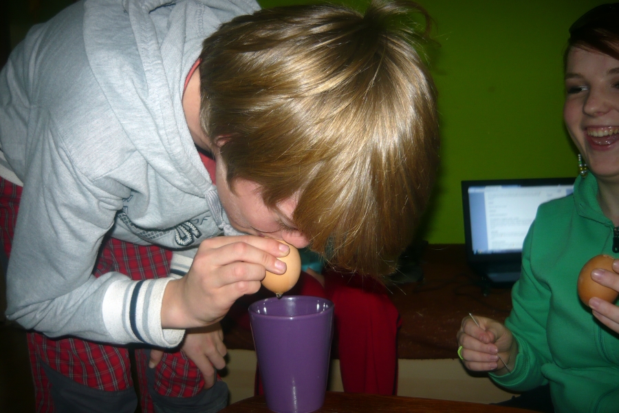 Počas Zeleného štvrtku sa teda skupinky stretli so svojimi animátormi u niekoho doma a netrpezlivo čakali na zadanie. Presne o 14:00 sa na internetovej stránke objavilo zadanie, a tak sa každá skupinka určite s veľkým entuziazmom pustila do fúkania vajec a ich zdobenia :). Podmienkou pre skupinky bolo odovzdať ich výtvor v klubovni v čo najkratšom čase a spoločne sa so svojím dielom odfotiť. V klubovni sme netrpezlivo čakali na prvé výsledky práce našich mladých a musím povedať, že sme nemuseli čakať dlho a už sa v klubovni objavila prvá skupinka (Dža!), neskôr prišli Ovce a s menším odstupom Maka ťukes, ktorej zaostávanie sme pochopili pri pohľade na krásne vyzdobené kraslice. Celkovo sa bodoval čas a estetická stránka ich výtvorov. 🙂