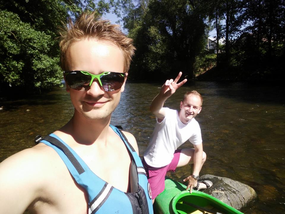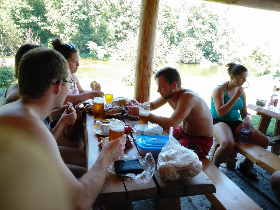 Splav začal v sobotu doobeda cestou autobusom do Banskej Bystrice a odtiaľ do Nemeckej. Počas tejto cesty nás mierne znepokojil dážď, no kým sme prišli do campu Nemecká, tak sa počasie ustálilo a vydržalo pekné až do konca splavu. V Nemeckej sme vyfasovali kanoe, pádla, vesty a barely. Po úvodnej inštruktáži a pokynoch sme sa pustili na vodu. Po niekoľkých splavených metroch sa postupne každý dostal do svojej roly háčika či kormidelníka. Počas sobotňajšieho splavu sme sa zastavili okrem občerstvenia v campoch aj na skale Kráľovná odkiaľ tí odvážnejší skákali do vody. Deň sme ukončili neďaleko dediny Slovenská Ľupča, kde sme si vytvorili vlastný camp. Pri výhľade na Ľupčiansky hrad sme sa porozprávali, opiekli špekačky a neskôr sme šli spať.
