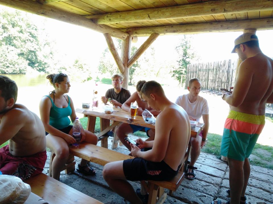 V nedeľu nás čakal náročnejší úsek. Na úvod sme prešli perejami na hati prečerpávajúcej stanice Biotika, niektorí skončili suchí, iní mokrí. Ďalšie pereje nás čakali pred Šalkovou. Po dobrodružstve na búrlivejšej vode, sme zastali na občerstvenie v obci Šalková. V nej sa nachádza aj hať, ktorá nie je splavná, a tak sme museli prenášať naše kanoe pár metrov po súši.
