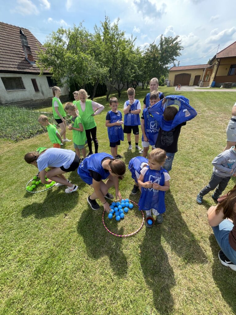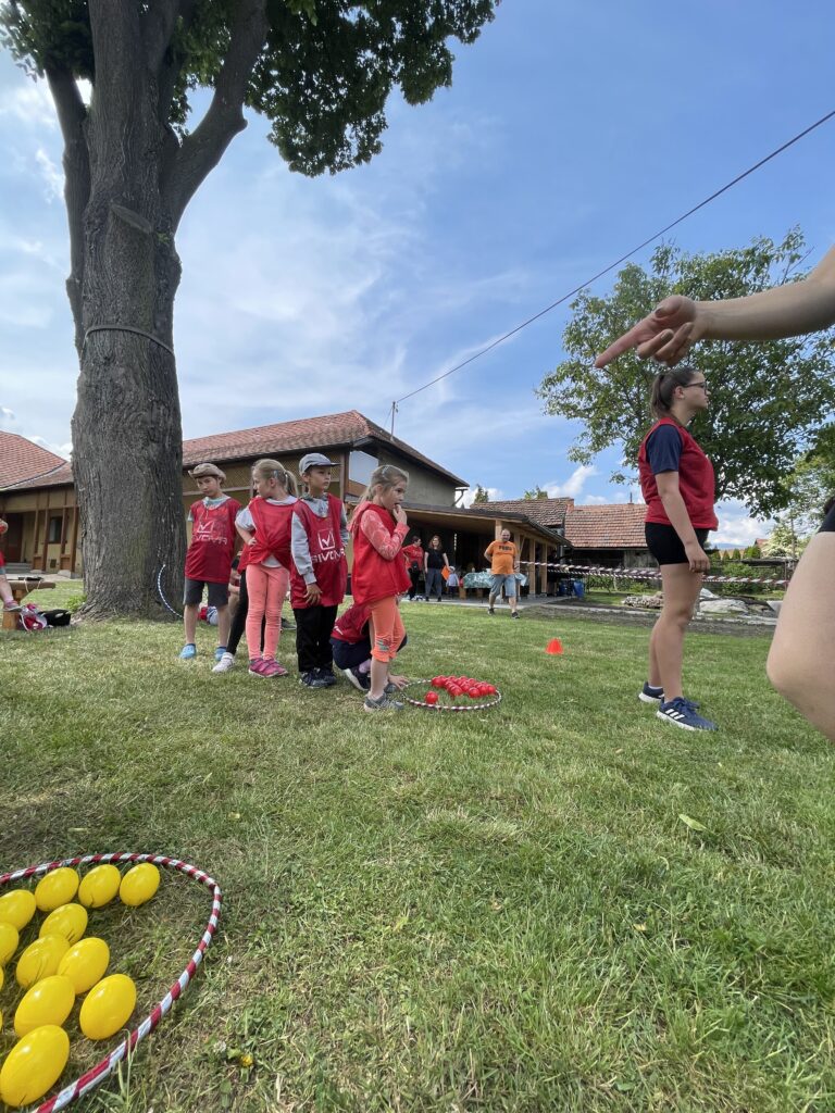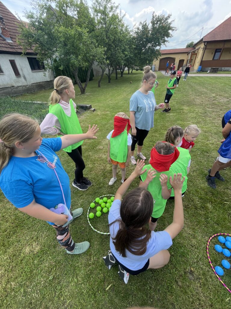 Keď bolo všetko pripravené, rozdelili sme sa do tímov a mohli sme začať. Na nohe sme mali uviazaný kvetináč, v ktorom sme prenášali loptičku na rôzne spôsoby, najprv s otvorenými očami, potom so zaviazanými a nakoniec sme mali v pároch zviazané nohy a spolu sme mali prejsť ku kužeľu a zobrať ho.