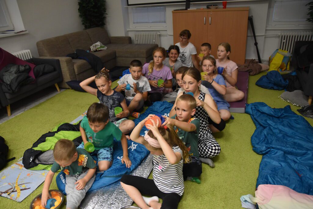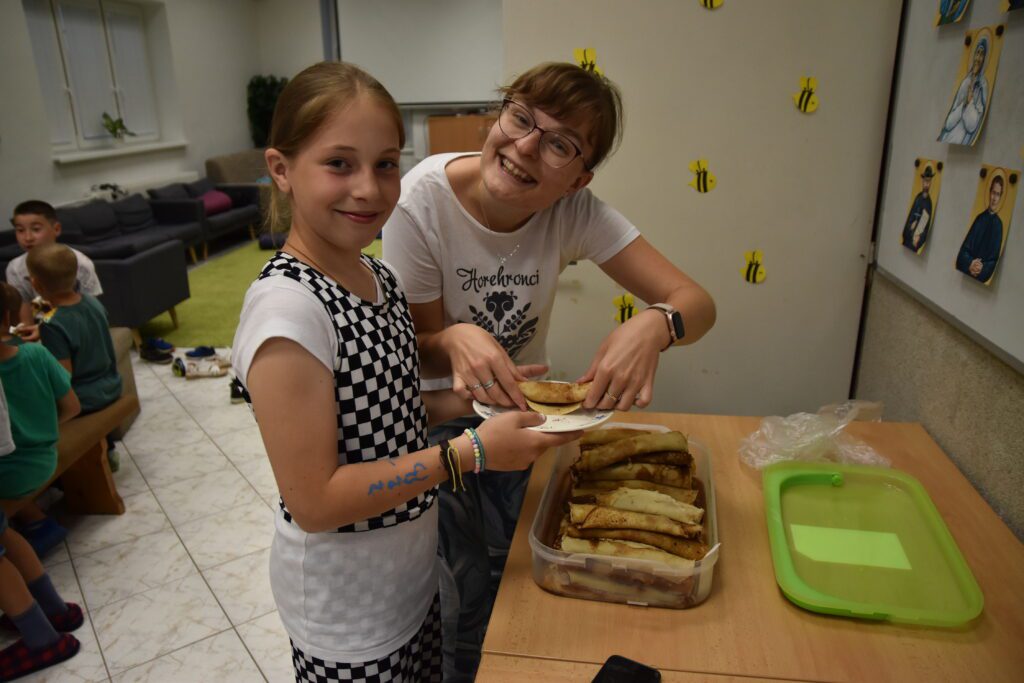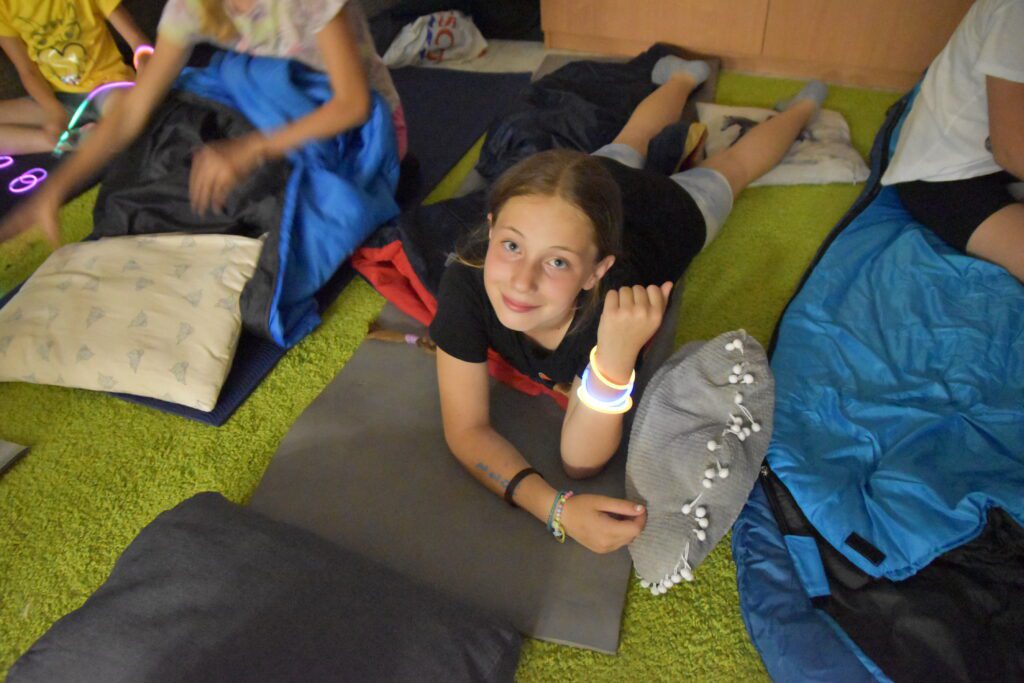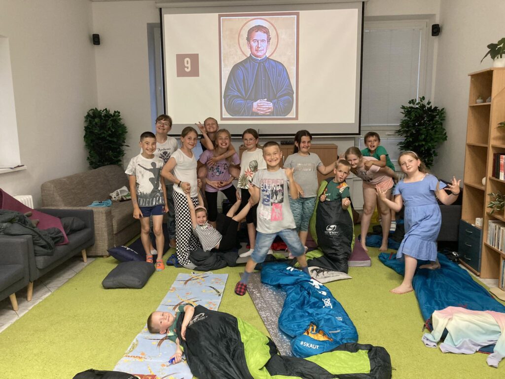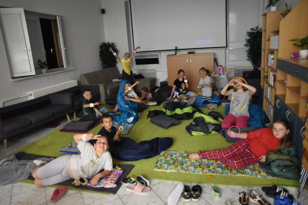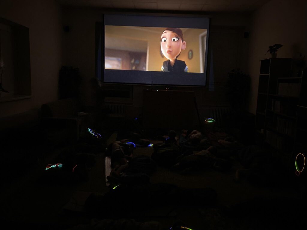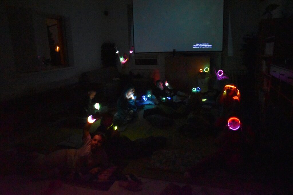 Stretnutie sme mali v klubovni po sv. omši o 19:00. Keď sme sa tam všetci stretli, odložili sme si veci a sadli k stolu, kde nás čakali voňavé palacinky, ktoré pre nás pripravila teta Holomáňová. Na výber sme mali lekvárové a nutelové. Každý si dal tie, na ktoré mal chuť. K palacinkám nám nechýbala šľahačka a granko. Boli výborné,ďakujeme! Keď sme dojedli, rozdelili sme sa na 2 skupinky a začali hrať kvíz o svätých. Potom sme si sadli na koberec a hrali spoločné hry, ako napr. mačka a myš. Keď sa zotmelo, čakala nás nočná hra. Najprv išla prvá skupinka, potom druhá. Prešli sme do farskej záhrady a museli sme byť potichu. Bola tam veľká tma, ale na zemi boli rozmiestnené svietiace náramky. Boli tam tri dievčatá, 2 boli za stromom, jedna v kríkoch. Hra spočívala v tom, že sme mali vylúštiť tajničku. Jednotlivé indície boli uložené vo svietiacich náramkoch. A aby to nebolo také jednoduché, boli tam dvaja chytači. Zo začiatku nás nenaháňali, ale potom to bolo ťažšie a ťažšie. Výsledok tajničky bolo: „Svätosť je aj pre teba“. Druhou časťou hry bolo nájsť poklad s odmenou. Museli sme nájsť veľké vajíčka, kde bol kľúčik. Keď sme našli to správne vajíčko, bežali sme ku truhle, aby sme ju otvorili. Našli sme tam sladkosti a svietiace náramky, každý si mohol zobrať. Celí unavení sme sa postupne chodili prezliekať do pyžama. Keď sme sa uložili do spacákov, spoločne sme sa pomodlili desiatok ruženca. V závere sme si pustili rozprávku na dobrú noc a postupne zaspali. Ráno sme sa zobudili, umyli si zuby, poupratovali, pobalili sme sa a veselí sme šli domov a kto chcel, mohol ísť do kostola.