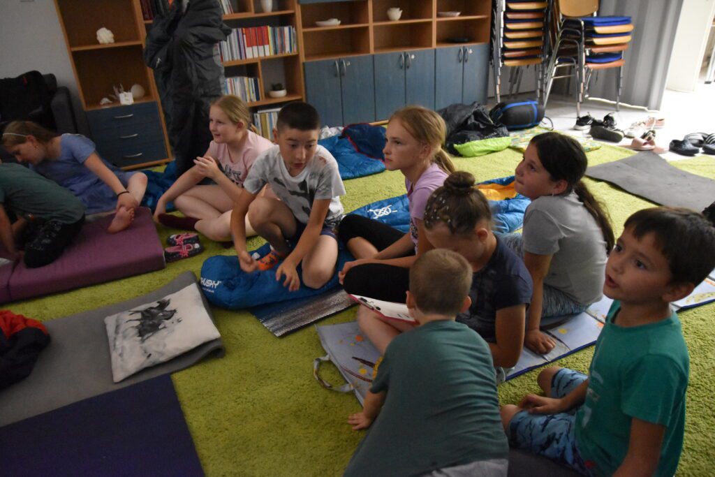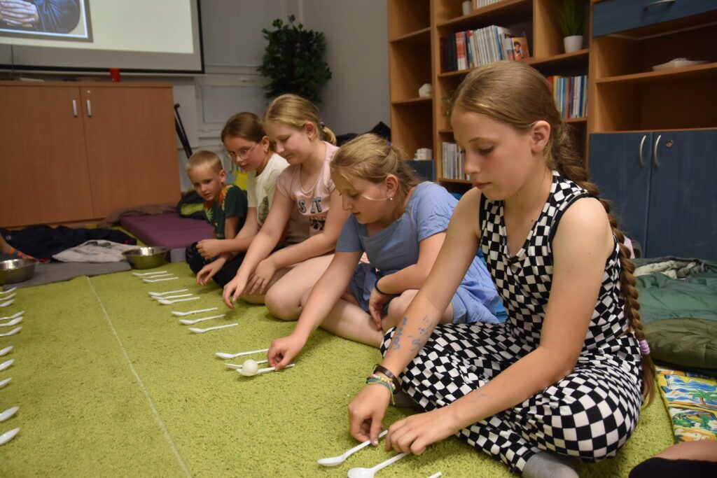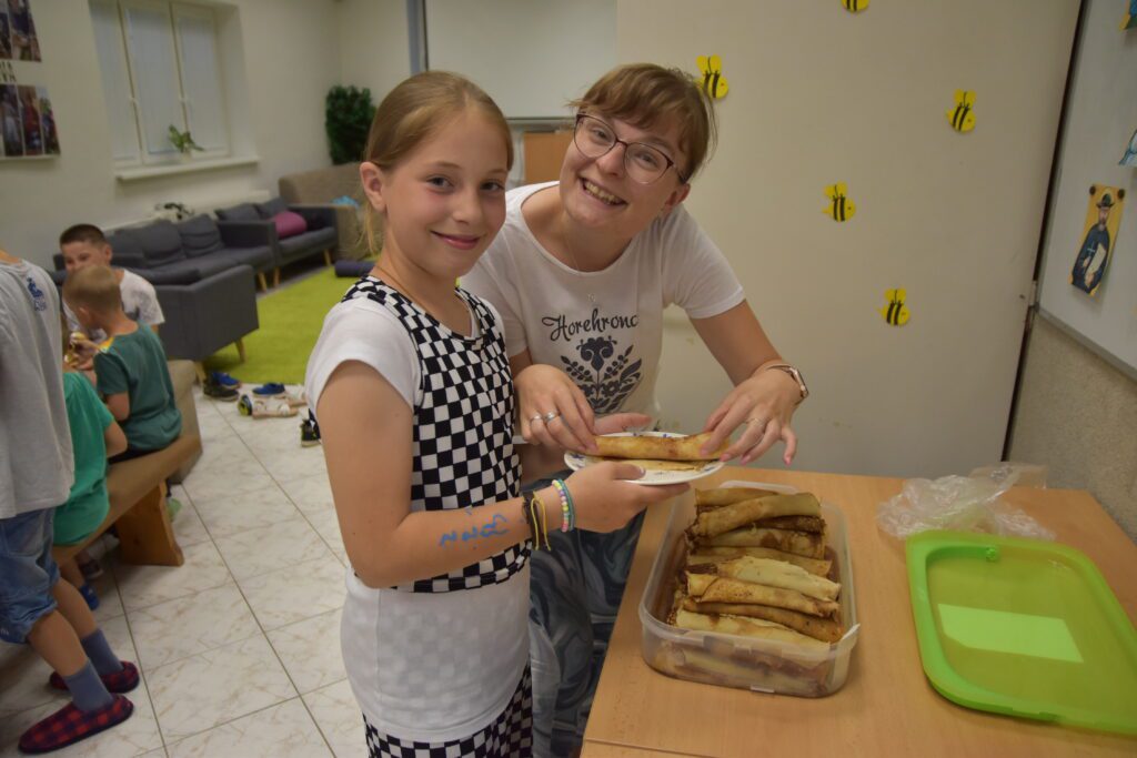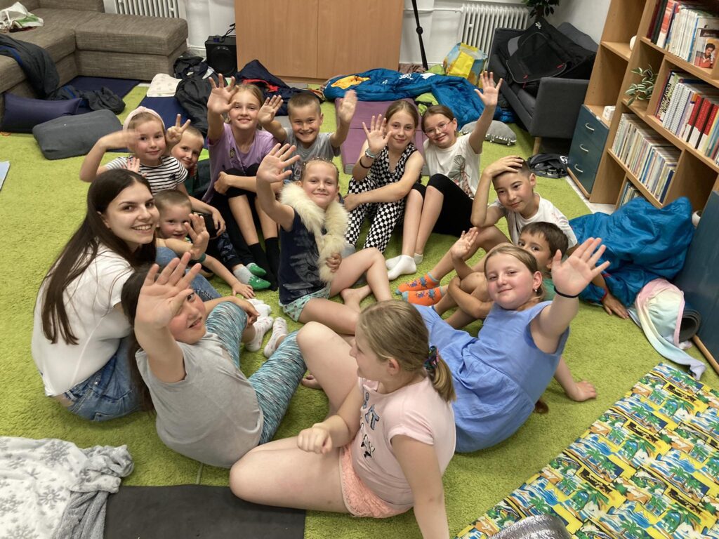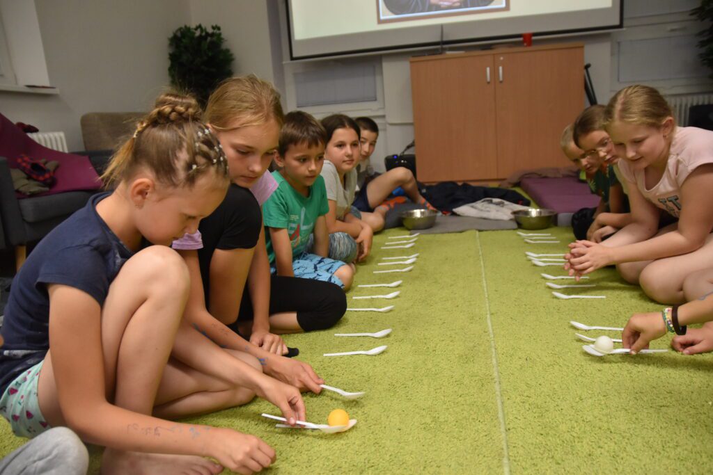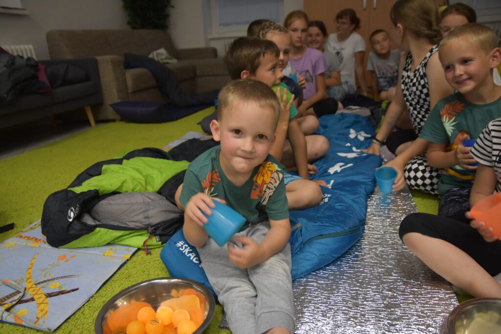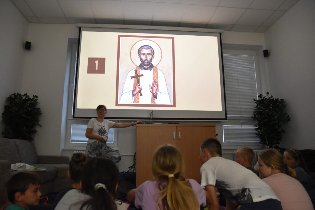 Stretnutie sme mali v klubovni po sv. omši o 19:00. Keď sme sa tam všetci stretli, odložili sme si veci a sadli k stolu, kde nás čakali voňavé palacinky, ktoré pre nás pripravila teta Holomáňová. Na výber sme mali lekvárové a nutelové. Každý si dal tie, na ktoré mal chuť. K palacinkám nám nechýbala šľahačka a granko. Boli výborné,ďakujeme! Keď sme dojedli, rozdelili sme sa na 2 skupinky a začali hrať kvíz o svätých. Potom sme si sadli na koberec a hrali spoločné hry, ako napr. mačka a myš. Keď sa zotmelo, čakala nás nočná hra. Najprv išla prvá skupinka, potom druhá. Prešli sme do farskej záhrady a museli sme byť potichu. Bola tam veľká tma, ale na zemi boli rozmiestnené svietiace náramky. Boli tam tri dievčatá, 2 boli za stromom, jedna v kríkoch. Hra spočívala v tom, že sme mali vylúštiť tajničku. Jednotlivé indície boli uložené vo svietiacich náramkoch. A aby to nebolo také jednoduché, boli tam dvaja chytači. Zo začiatku nás nenaháňali, ale potom to bolo ťažšie a ťažšie. Výsledok tajničky bolo: „Svätosť je aj pre teba“. Druhou časťou hry bolo nájsť poklad s odmenou. Museli sme nájsť veľké vajíčka, kde bol kľúčik. Keď sme našli to správne vajíčko, bežali sme ku truhle, aby sme ju otvorili. Našli sme tam sladkosti a svietiace náramky, každý si mohol zobrať. Celí unavení sme sa postupne chodili prezliekať do pyžama. Keď sme sa uložili do spacákov, spoločne sme sa pomodlili desiatok ruženca. V závere sme si pustili rozprávku na dobrú noc a postupne zaspali. Ráno sme sa zobudili, umyli si zuby, poupratovali, pobalili sme sa a veselí sme šli domov a kto chcel, mohol ísť do kostola.