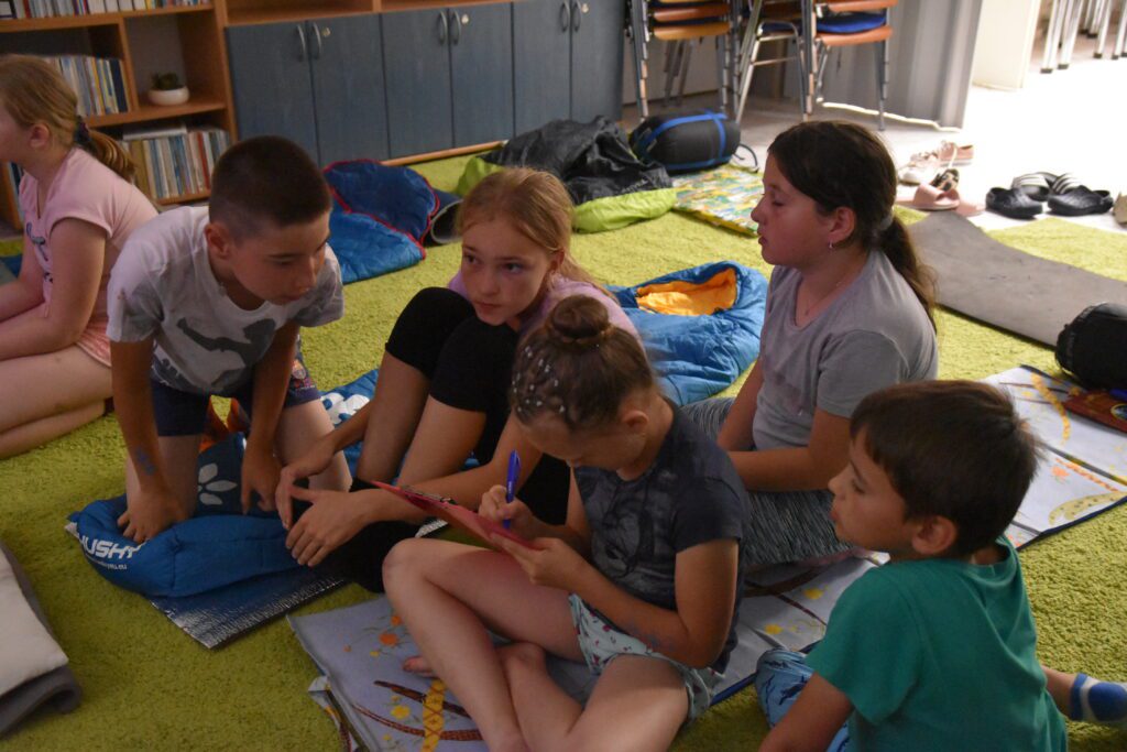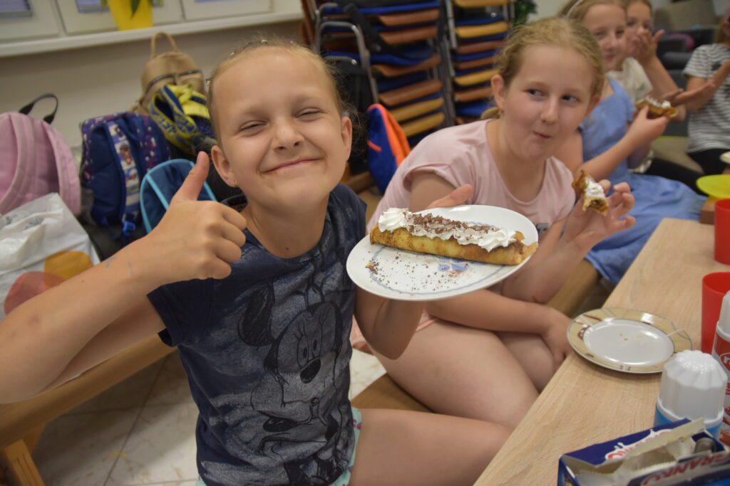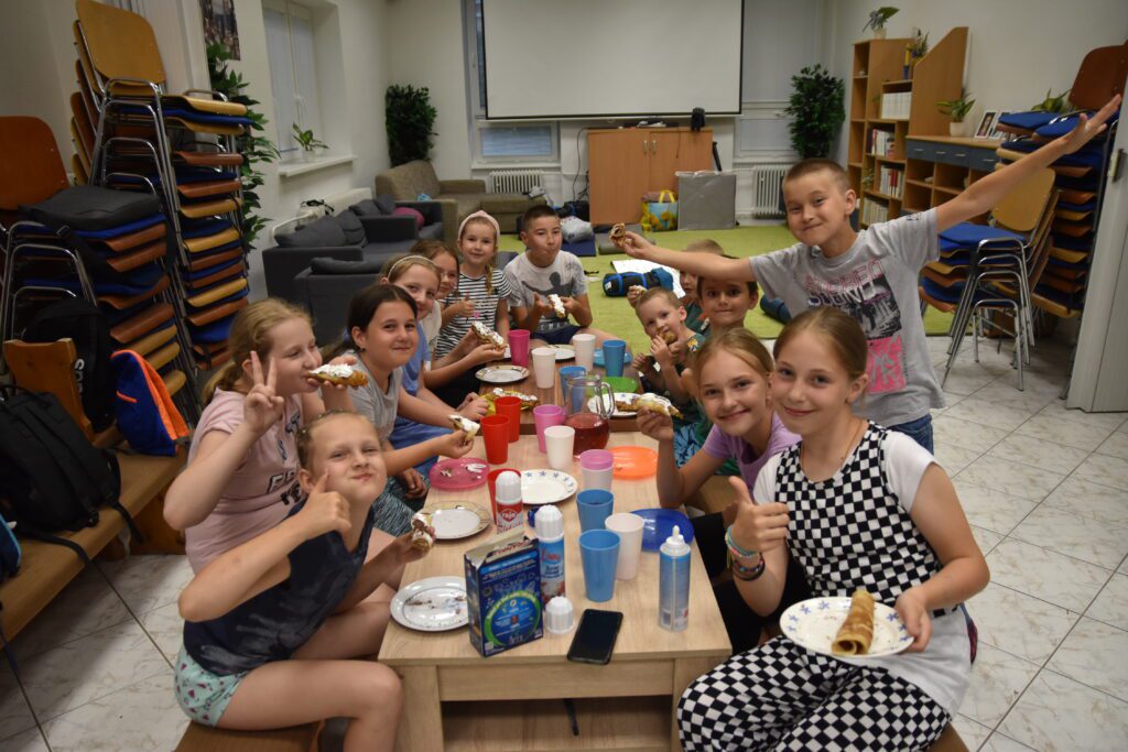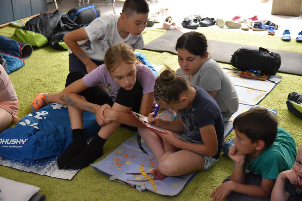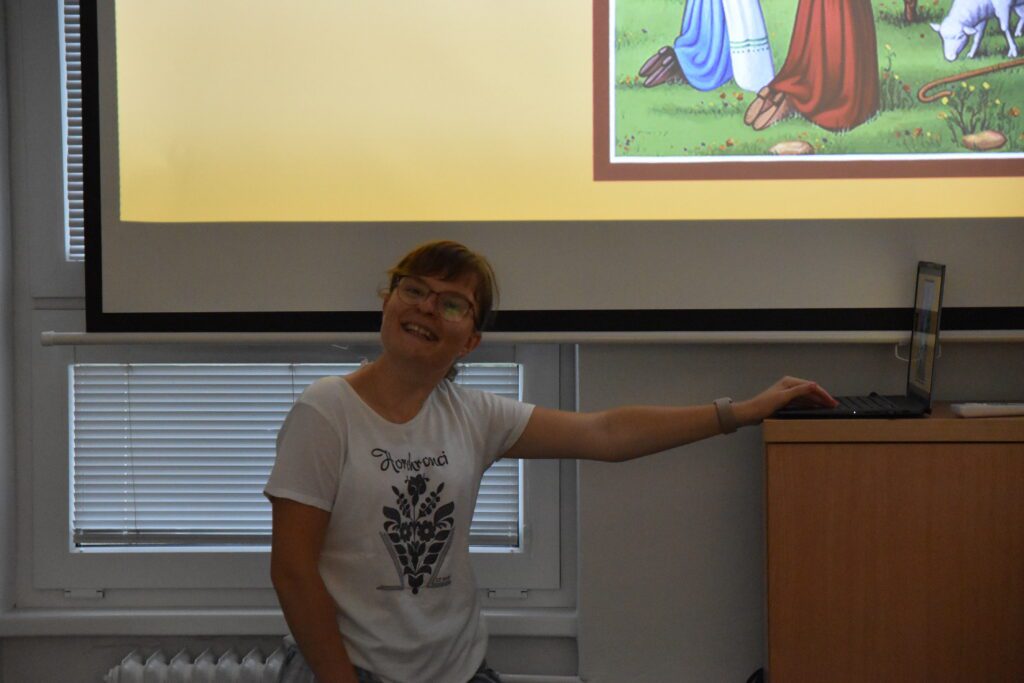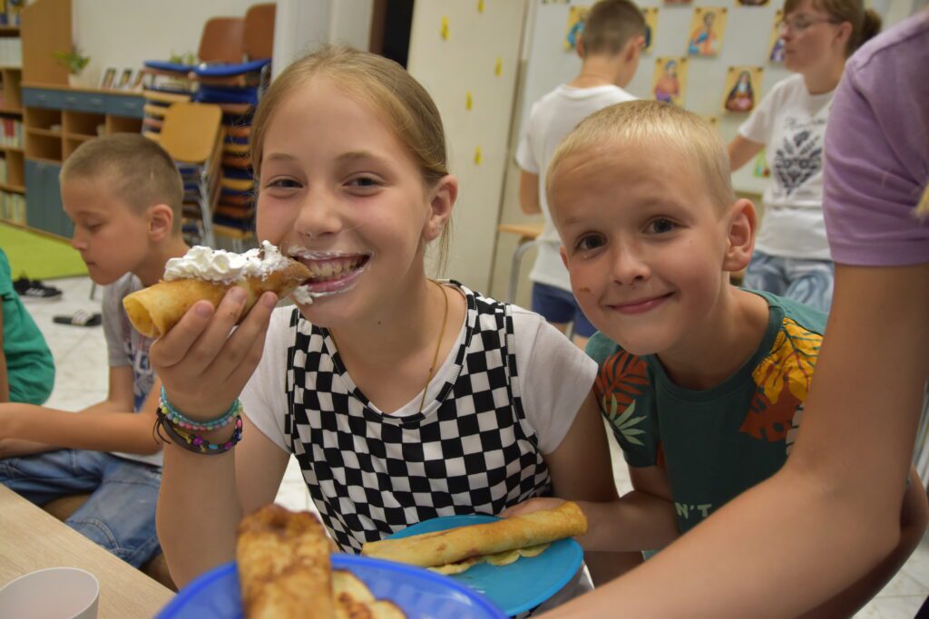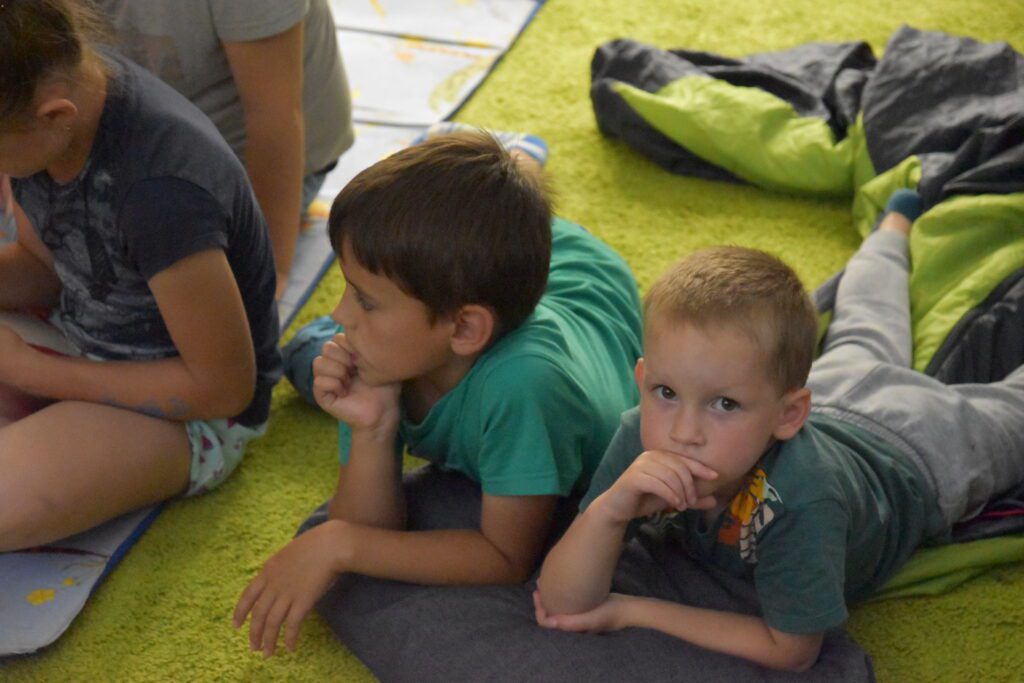 Stretnutie sme mali v klubovni po sv. omši o 19:00. Keď sme sa tam všetci stretli, odložili sme si veci a sadli k stolu, kde nás čakali voňavé palacinky, ktoré pre nás pripravila teta Holomáňová. Na výber sme mali lekvárové a nutelové. Každý si dal tie, na ktoré mal chuť. K palacinkám nám nechýbala šľahačka a granko. Boli výborné,ďakujeme! Keď sme dojedli, rozdelili sme sa na 2 skupinky a začali hrať kvíz o svätých. Potom sme si sadli na koberec a hrali spoločné hry, ako napr. mačka a myš. Keď sa zotmelo, čakala nás nočná hra. Najprv išla prvá skupinka, potom druhá. Prešli sme do farskej záhrady a museli sme byť potichu. Bola tam veľká tma, ale na zemi boli rozmiestnené svietiace náramky. Boli tam tri dievčatá, 2 boli za stromom, jedna v kríkoch. Hra spočívala v tom, že sme mali vylúštiť tajničku. Jednotlivé indície boli uložené vo svietiacich náramkoch. A aby to nebolo také jednoduché, boli tam dvaja chytači. Zo začiatku nás nenaháňali, ale potom to bolo ťažšie a ťažšie. Výsledok tajničky bolo: „Svätosť je aj pre teba“. Druhou časťou hry bolo nájsť poklad s odmenou. Museli sme nájsť veľké vajíčka, kde bol kľúčik. Keď sme našli to správne vajíčko, bežali sme ku truhle, aby sme ju otvorili. Našli sme tam sladkosti a svietiace náramky, každý si mohol zobrať. Celí unavení sme sa postupne chodili prezliekať do pyžama. Keď sme sa uložili do spacákov, spoločne sme sa pomodlili desiatok ruženca. V závere sme si pustili rozprávku na dobrú noc a postupne zaspali. Ráno sme sa zobudili, umyli si zuby, poupratovali, pobalili sme sa a veselí sme šli domov a kto chcel, mohol ísť do kostola.