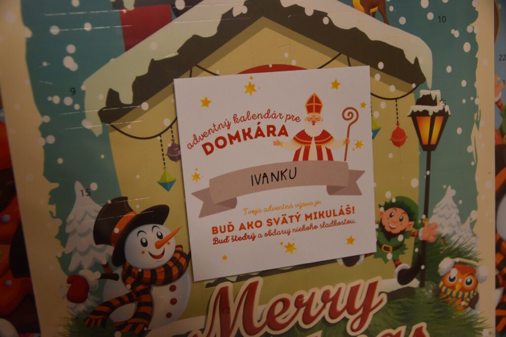 Svätého Mikuláša snáď nikomu nemusím predstavovať. Každoročná tradícia obdarovania, ktorá sa s ním spája, poteší nejedno malé, či veľké dieťa. Čaro prekvapenia sa spája s veľkou radosťou, ktorá tentokrát bola pre nás veľmi nečakaná a výnimočná. Pre našich členov Domky nám tajomný Mikuláš priniesol adventné kalendáre. Neobyčajný kalendár s mikulášskou výzvou čakal našich 60-tich domkárov v stredu 6.12. pred dverami ich domčekov. Krásni anjeli (naše domkárky) to v zasneženom počasí stihli včas rozdať. Za ich veľkú obetu a čas im patrí veľká vďaka.