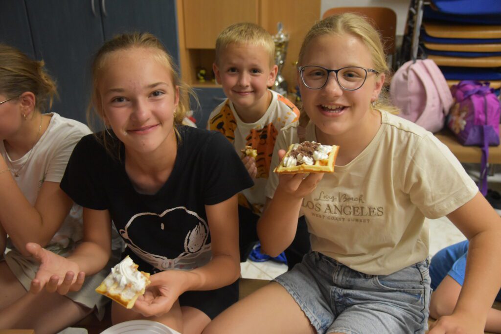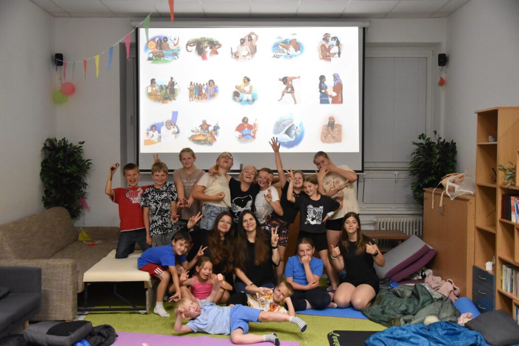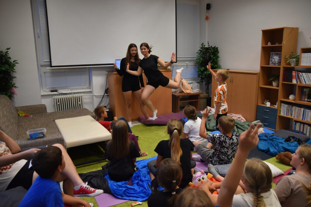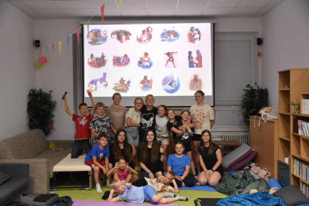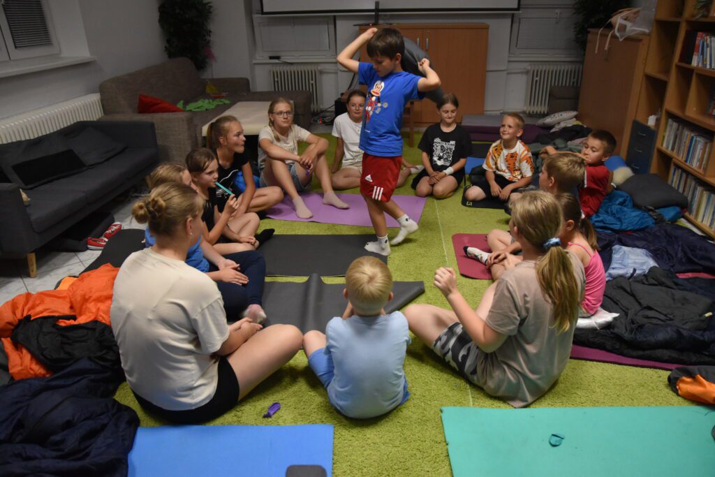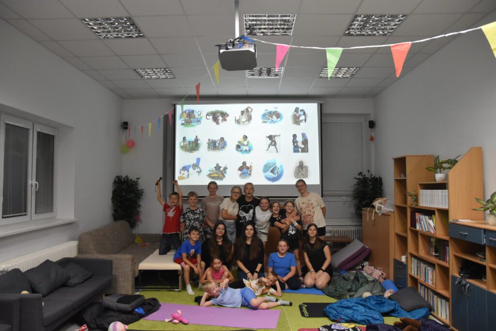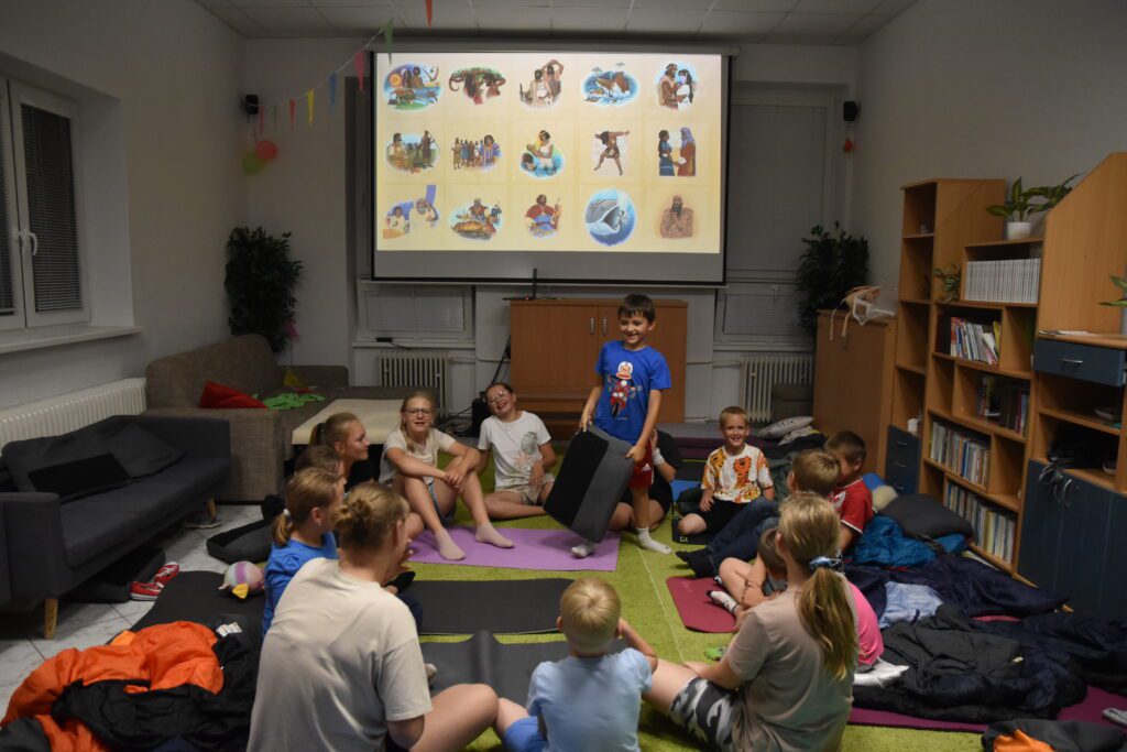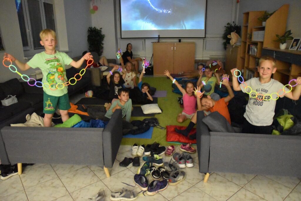 Táto super prespávačka sa začala svätou omšou, kde sme privítali Pána Boha. Po svätej omši sme šli do klubovne Domky. Tentokrát sme nezačali večerou, ako minulý rok, ale hrami. Rozdelili nás na dve skupinky. Prvá hra spočívala v tom, že sme sa mali podľa skupiniek dať do dvoch radov. Na obrazovke sa objavovali tiene zvierat. Našou úlohou bolo vykríknuť správne zviera. Kto vykríkol správne, tak sa zaradil na koniec radu. Po skončení hry sa zrátali body. Ďalšia hra bola o postrehu. Všetci sme si posadali do kruhu a jeden z nás bol v kruhu. Mali sme jeden chvost, ktorý nemohol daný človek vo vnútri kruhu vidieť. Ako sme mali spolu nohy, tak to bolo náročnejšie. Keď sa začala hra, tak chvost sa pohyboval medzi našimi nohami. Keď to daný človek chytil, vystriedal si miesto so sediacimi. Samozrejme, že po všetkých hrách sme boli hladní, takže nás čakali wafle s nutelou alebo lekvárom. Wafle boli veľmi dobré a chutné. Po večeri sa vydala jedna skupinka na nočnú hru a druhá čakala. Nočná hra spočívala v tom, že sme mali byť po tichu a v svietiacich krúžkoch boli vajíčka. Vo vajíčkach sa objavovali papieriky, no v niektorých neboli. Na papieriku sme mali písmeno a nad ním číslo. Podľa čísel sme mali určiť písmeno. No aby sme to nemali také ľahké, tak nás chytali staršie baby. Keď nás chytili, mali sme sa vrátiť na stanovisko. A potom sme mohli znova ísť hľadať papieriky. Po vylúštení sme sa vrátili do klubovne. Keď sa skupinky vystriedali, umyli sme si zuby a prezliekli sa do pyžám. Unavení sme sa vrátili do spacákov. Na dobrú noc nám baby pustili rozprávku. Ráno nás zobudili o 7:00, kedy sme sa pobalili a prezliekli a odišli sme domov. Tento zážitok bol úžasný a teším sa na ďalší rok.